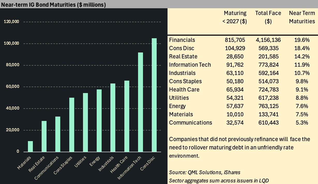 Our analysis focuses on ~400 investment grade debt issuers in the iShares iBoxx $ Investment Grade Corporate Bond ETF (ticker LQD), a liquid subset of the larger corporate bond universe. The refinancing risk story is broken into three parts: